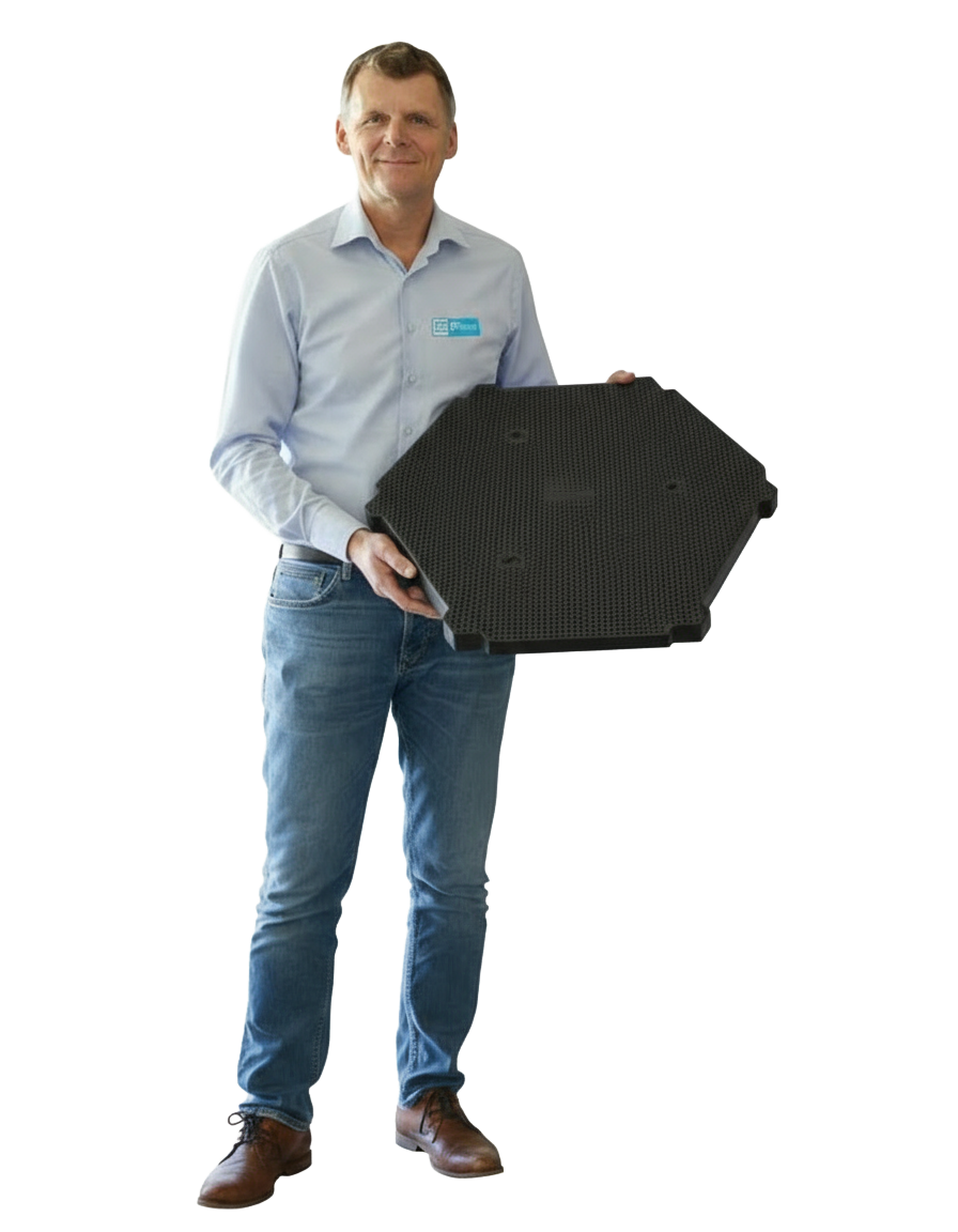 Protecting Floor Tiles makes it easy to create a stable ground, even on weak surfaces like clay. The special ribbed underside locks with the ground material, keeping the tiles steady. The only limitation is that the ground must not be sinking, such as swampy or moorland areas.